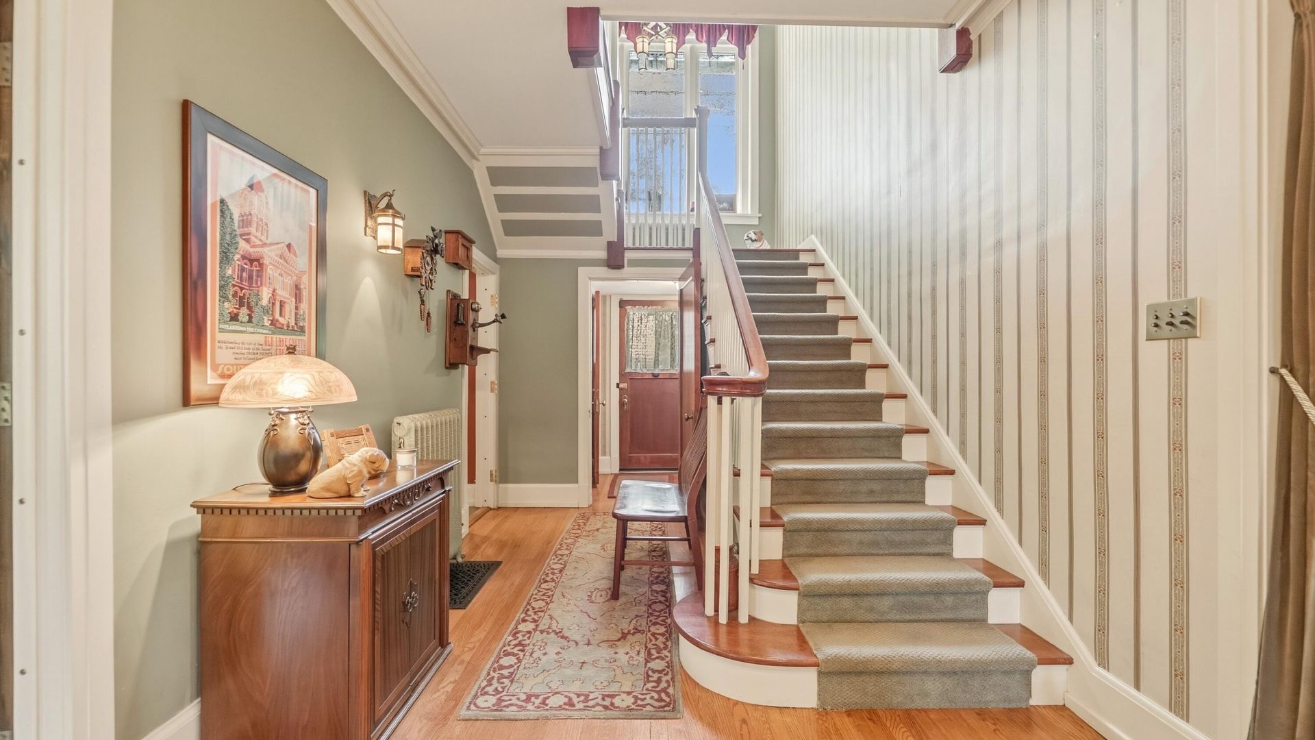 The Historic Maack House is now Available. ........Step into timeless elegance in this circa 1913 historic home, offering over 4,300 square feet of character and craftsmanship in the heart of Crown Point's sought-after Ruffle Shirt Hill. Listed on the National Historic Registry, this 4-bedroom, 3-bath residence blends architectural heritage with spacious living. A grand foyer welcomes you with original hardwood floors that flow throughout the home. The expansive living room features a stunning all-brick wood-burning fireplace, while a light-filled sunroom just beyond offers walls of windows and a second floor to ceiling brick cozy fireplace--perfect for relaxing year-round. The formal dining room is a true showpiece, highlighted by original stained glass windows and an impressive coffered, beamed ceiling--ideal for entertaining. Upstairs, a graceful staircase leads to four bedrooms, including former maid's quarters with a powder room, along with additional bedrooms offering generous closet space and a full bath. The landing showcases more beautiful stained glass, adding to the home's historic charm. The third floor is a one-of-a-kind retreat, featuring a spectacular log cabin-style great room with vaulted pine ceilings, a striking stone, electric fireplace, and an open loft--perfect as a gathering space, studio, or private getaway.Full unfinished basement with outside entry and tons of storage. This is a rare opportunity to own a piece of history with unmatched character and space. Updates include boiler 2023, updated eat in kitchen ,Unico AC and 2 condenser,flat roofs,chimney tuck pointed,whole house generator . You don't want to miss this one. More detailed history of the Maack House is in attachments.
