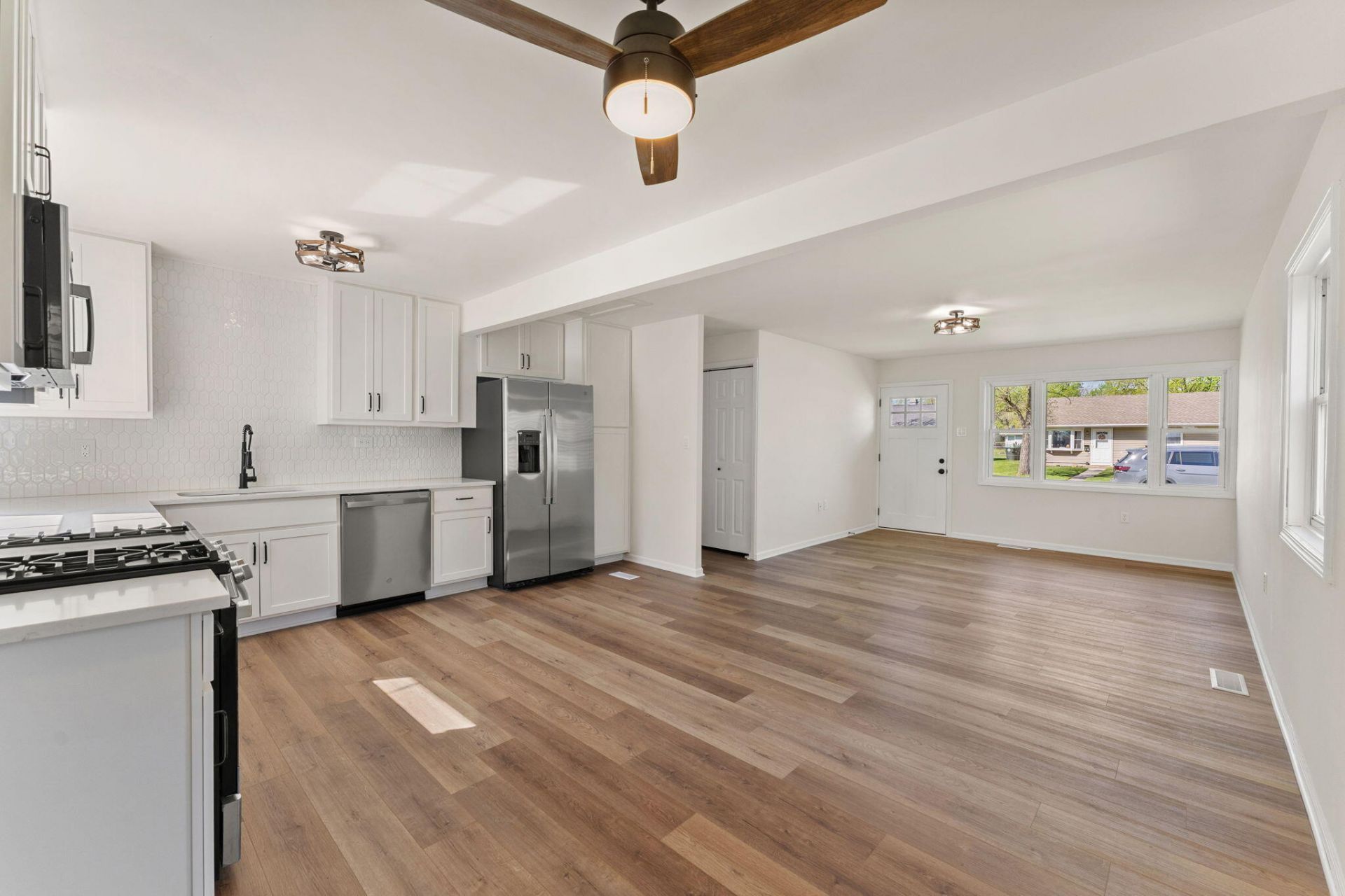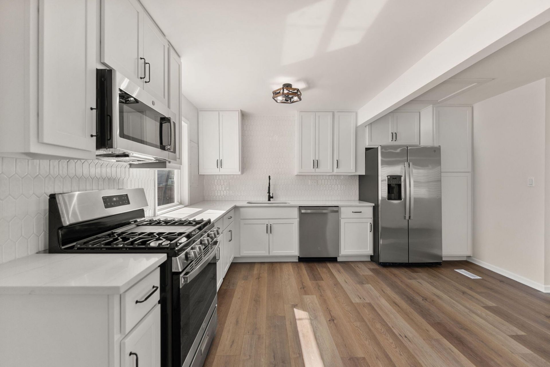 Welcome to this charming and beautifully updated home offering 3 bedrooms, 1 bathroom, and over 1,300 square feet of inviting living space, situated in an established Hobart neighborhood within walking distance to Veterans Elementary School. When you step inside, you are welcomed into a bright living room that flows seamlessly into the updated kitchen, complete with quartz countertops, soft close cabinets, and modern finishes. Just beyond the kitchen, you will find a spacious family room, perfect for relaxing or entertaining, with a sliding glass door that leads directly to the backyard. Off the main living room, a hallway leads to a private wing of the home featuring all three bedrooms and a fully updated bathroom. LVP flooring runs throughout, complemented by newer windows that bring in plenty of natural light. Outside, you will find a nice sized backyard that has been freshly seeded, with new grass already starting to grow. A detached two car garage provides ample storage and parking space. This home is move in ready and a must see. Schedule your showing today.