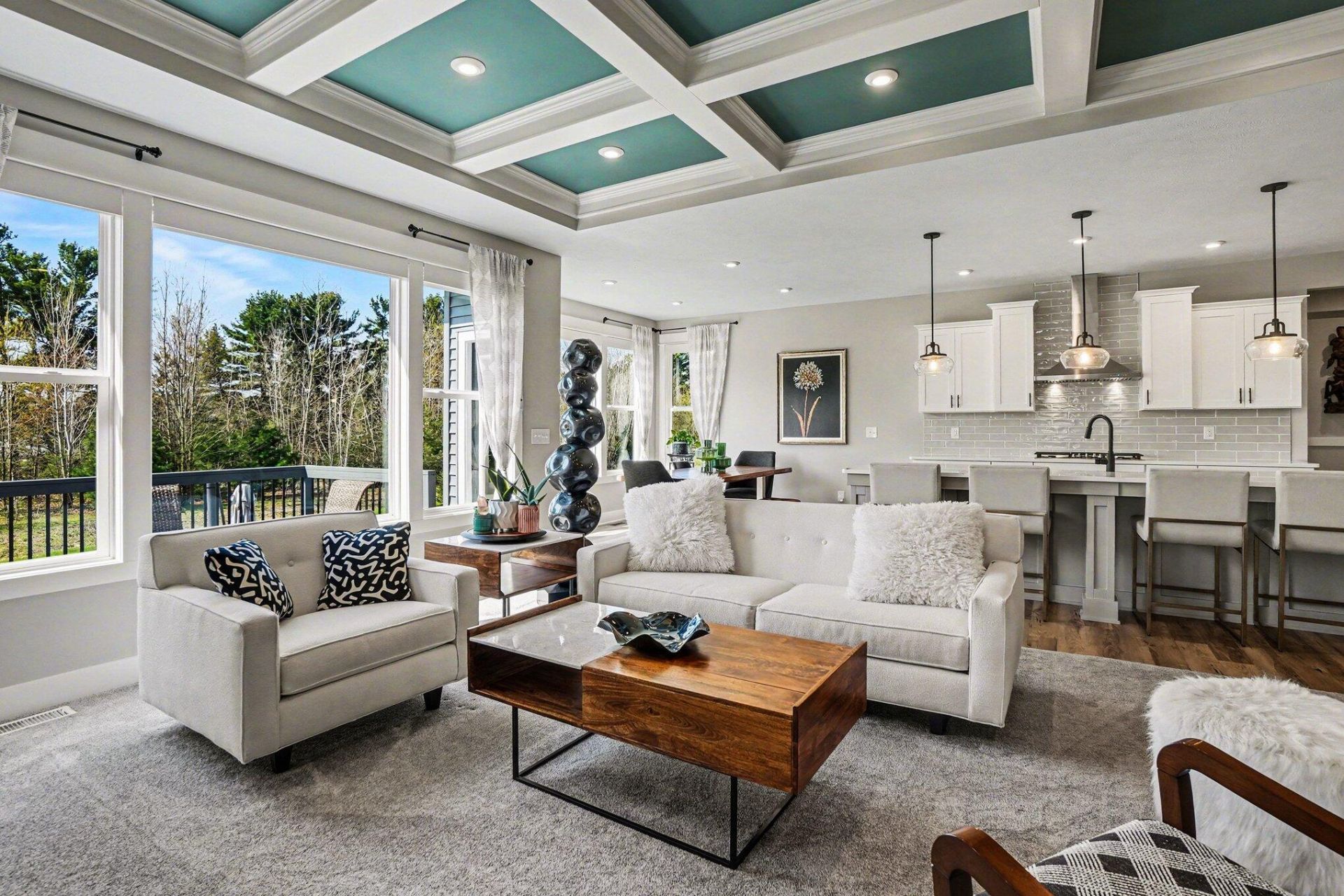 Located on a large lot in the distinctive homes community in Macatawa Legends Estates, this former model home features the Maxwell floor plan with four bedrooms, three full baths, and 3,273 finished sq. ft., along with high end custom options and features. Warm curb appeal extends from the pillared front porch to the ledger stone accents and architectural arches and roofline, making this home truly stunning. The front entry hall opens to a formal dining area featuring frosted French doors and a batten board accent wall; this space can also be utilized as an office area. The dining room and entryway flow seamlessly into the large living, dining, and kitchen areas. A second gathering room/family room features a two-sided fireplace, while the living room fireplace wall includes bookshelves and built-ins. The living room also showcases a tray ceiling with beam accents. The kitchen is a dream, beginning with a large land/breakfast bar featuring a farmhouse-style stainless sink. Abundant cabinetry, a glass tile backsplash, a large walk-in pantry, dual wall ovens, a cooktop stove, and a French door refrigerator. The dining area offers sliding doors to a large stained deck overlooking the backyard. The front yard view is equally appealing, with a pond and a golf course fairway just across the road. The kitchen leads to a garage entry mudroom equipped with lockers, a utility/linen closet, a a coat closet. The main-level laundry room includes a folding counter and hanging bar shelves.The primary wing is tucked away and features a spacious bedroom suite with a dual-sink vanity, a walk-in tiled shower with European glass doors, a stool closet and a recently updated custom primary closet system. This system includes storage drawers, locked private drawers, and extensive hanging and shelving space, custom and designed by the owner with their preferred supplier, California Closets. The second main-level bedroom has access to the second full main bath via a private hall alcove that can be separated from the living room space by a sliding glass door.The lower level is filled with natural light from daylight windows. The recreation room includes three gathering areas: a built-in bar with peninsula seating and galley access to back wall cabinets, sink, and counter space; a TV/gaming area; and additional rear space with an alcove, ideal for a puzzle table or reading nook. The third and fourth bedrooms, along with a third full bath, are also located on this level. The rear mechanical room is currently being used as an exercise area. Additional upgrades by the owner include the custom primary closet system, remote control blinds on the main level, silhouette blinds in the lower level, and a zoned baffle system allowing independent heating and cooling control for each level. Exterior enhancements include a three-stall garage and a stained deck with steps leading to the backyard, which features a beautiful patio paver space. The property also includes lush landscape beds and an established yard with underground wiring already in place for a Husqvarna mobile mowing system The mobile mowing unit is available for separate purchase. Ring doorbell to remain. Association amenities are available as a separate fee/purchase through the HOA. Exclusions are: Buddha bust on the front entry table, artwork in back entry alcove, attached tvs (brackets will reman). any attached work out equipment/pulleys/pullup bars/ski erg pulldown system/shelving/mats etc. Washer